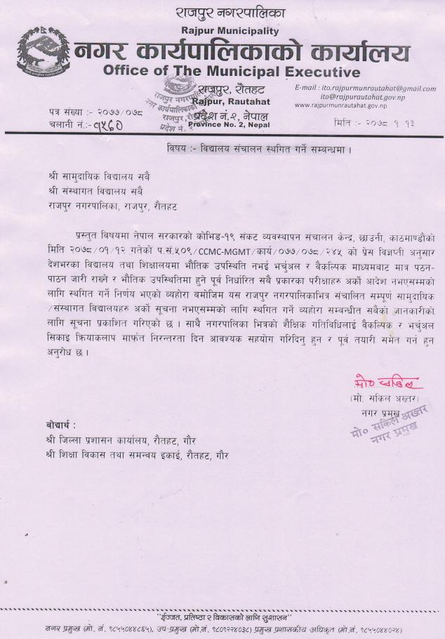 कोरोना माहामारी को कारणले राजपुर नगरपालिका भित्र को सबै स्कूल अस्थगन गरिएको |