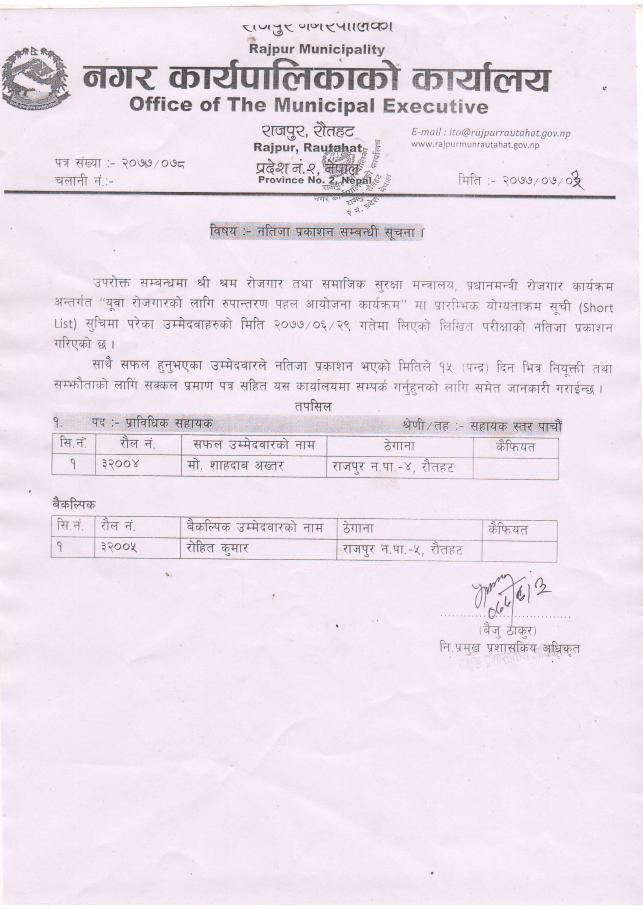 प्राविधिक सहायक स्तर पाचौ को नतिजा प्रकाशन सम्बन्धमा