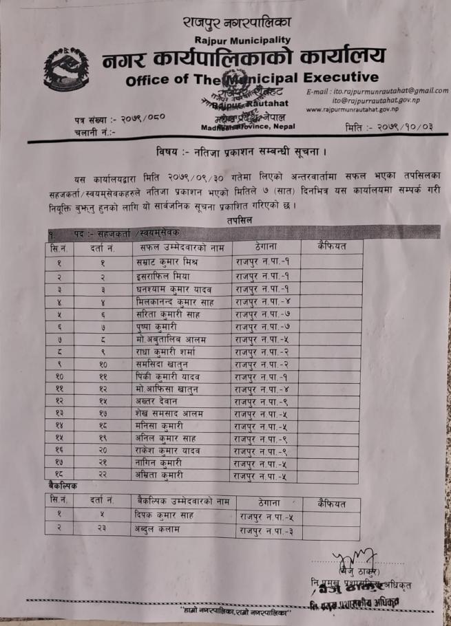 सहजकर्ता/स्वयम सेवकहरुको नतिजा प्रकाशन सम्बन्धि सुचना